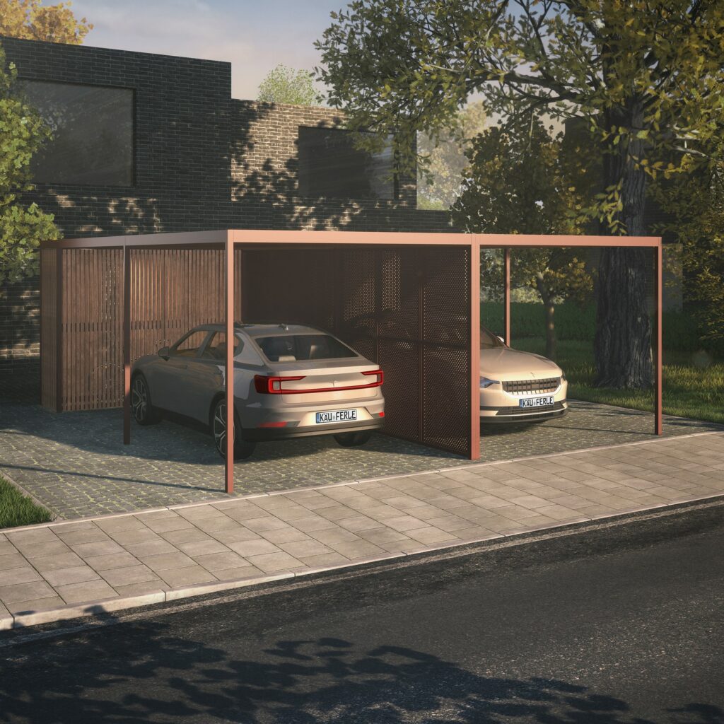 Carports müssen nicht rundum gleich ausgebildet sein. Je nach gestalterischen Vorgaben können unterschiedliche Seitenwandelemente dafür sorgen, sodass Carports einseitig oder auch an mehreren Seiten geschlossen sind. Dank der Stahlkonstruktion sind Carports von Käuferle flexibel konfigurierbar – egal, ob dort nur Pkws oder in direkt angebauten Einhausungen auch Fahrräder untergestellt werden sollen.