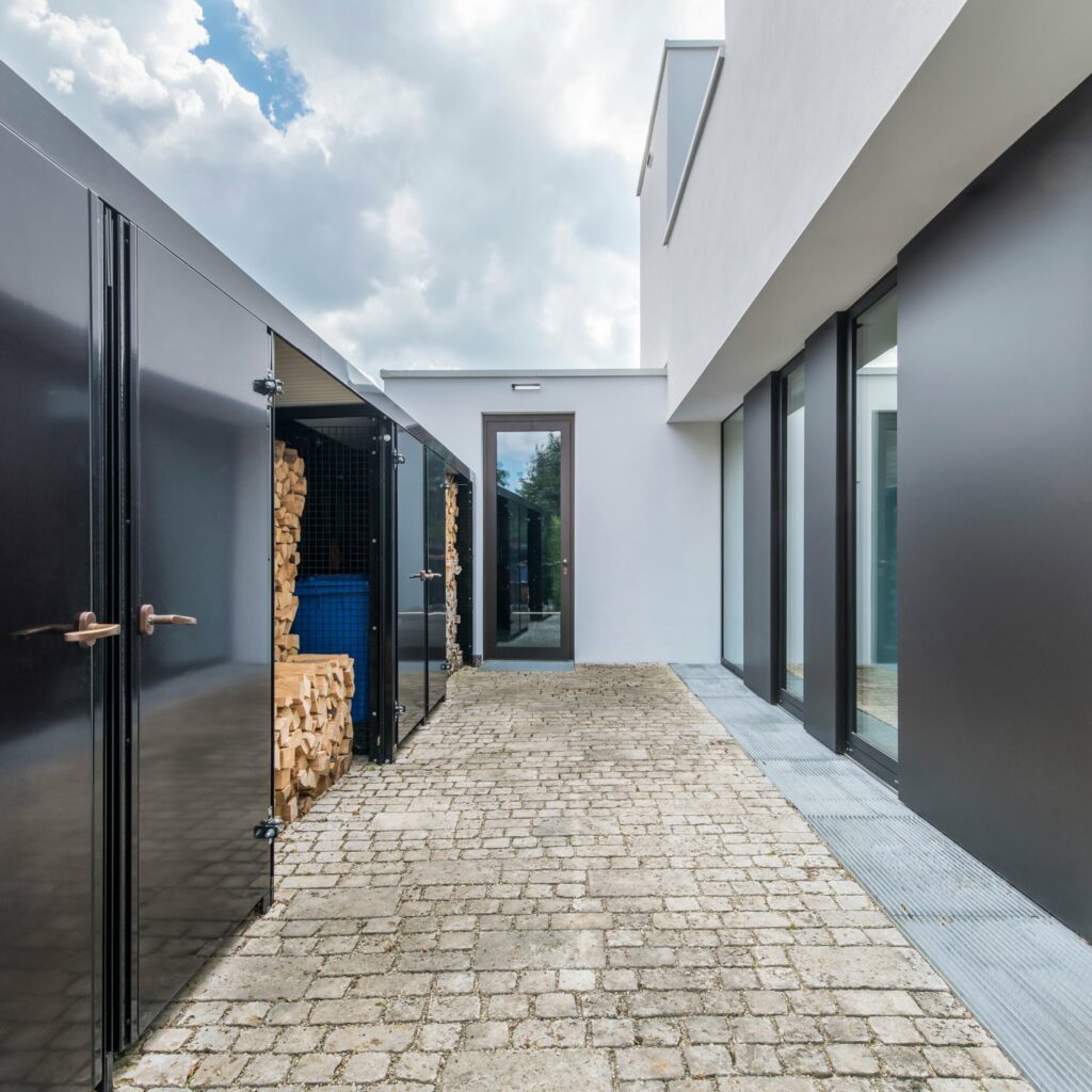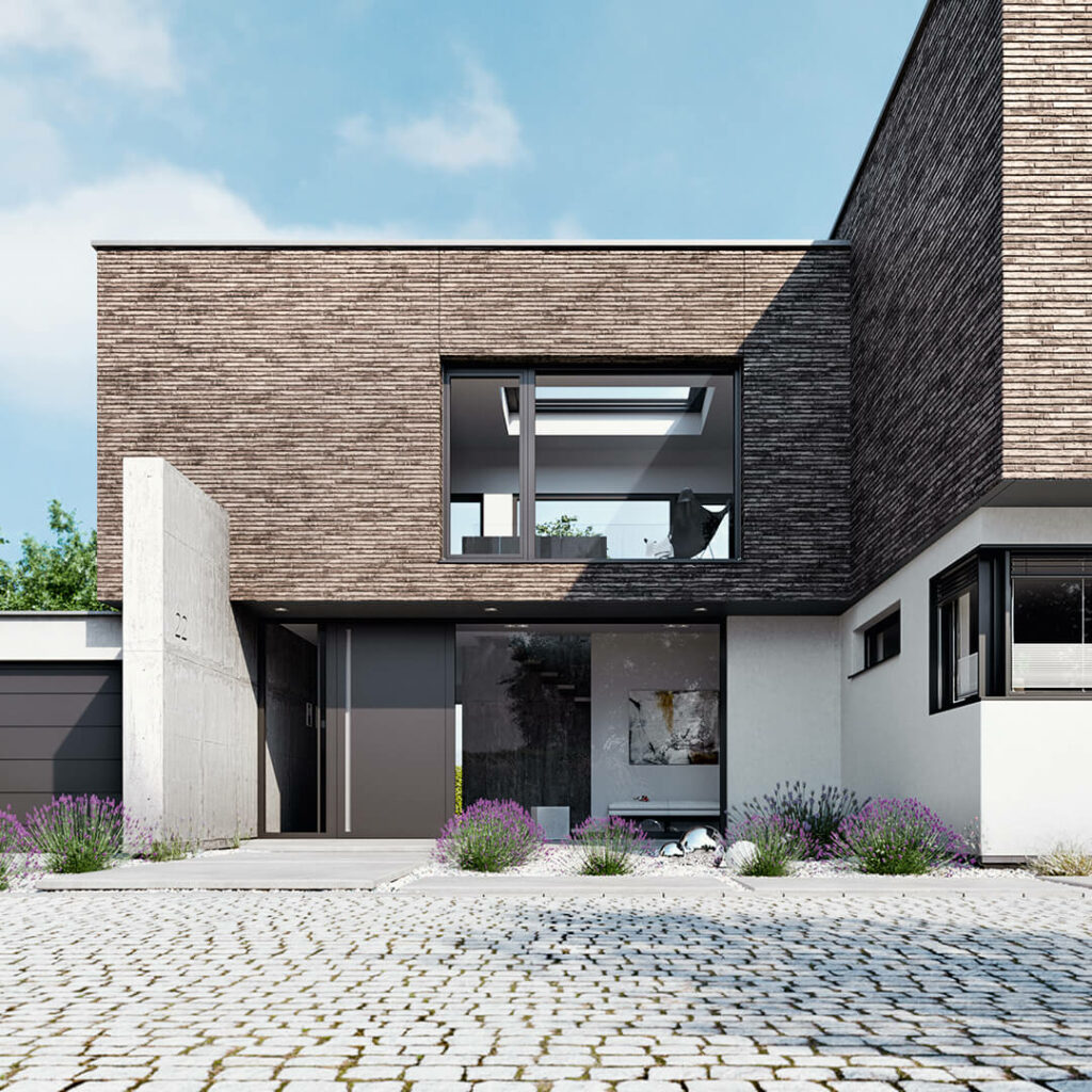 Nebeneingangstüren müssen nicht weiß sein. In puncto Gestaltungsfreiheit bieten sie vielmehr dieselben vielfältigen Möglichkeiten wie Haustüren: beispielsweise mit Holzdekorfolien, mit Glasfeldern mit oder ohne Sprossen oder mit Oberflächen in modernem Anthrazit, das für ein elegantes Erscheinungsbild sorgt. Anthrazit ist bei Nebeneingangstüren vor allem deshalb so beliebt, weil der Farbton perfekt mit weißen Fassaden und anthrazitfarbenen Fensterrahmen harmoniert.