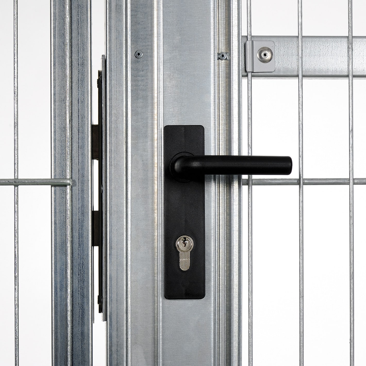 180° öffnend, aushängesichere Bänder (zweiteilig), vorgerichtet für Vorhängeschloss, lichte Durchgangsbreite mit bis zu 1250 mm, Standardsystemhöhe 1900/2050/2250 mm, alle Stahlteile feuerverzinkt